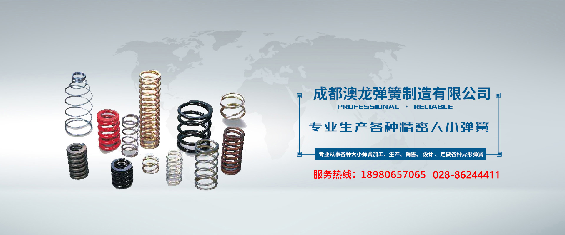 成都澳龍彈簧制造有限公司是一家專業從事各種大小彈簧加工、生產、銷售、 設計 、定做各種異形彈簧、專業生產各種精密大小彈簧、壓簧、壓縮彈簧、扭簧、雙扭簧、拉簧、卡簧、電池彈簧、 電子、電器開關彈簧、 工藝彈簧,汽車坐墊彈簧、氣門、閥門彈簧、碟形彈簧、異形扭簧、蝸卷彈簧、恒力彈簧、離合器彈簧、摩托車減震彈簧、汽配、摩配彈簧、汽車懸掛彈簧、制動彈簧、模具彈簧、沖壓件彈簧、沙發(fā)彈簧、床墊彈簧、彈簧包系列等等,并承接各種小五金、沖壓件機械及特定、不規(guī)則彈簧的加工服務。
